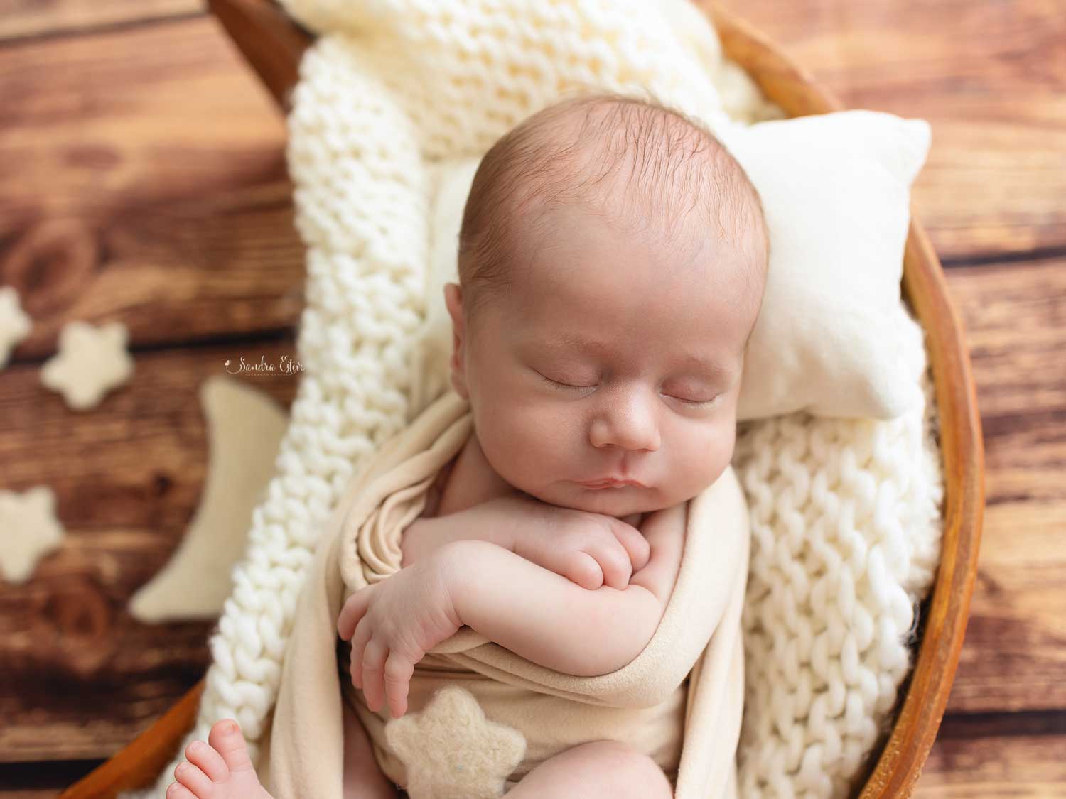 La sesión comenzó en nuestro estudio, un lugar diseñado para crear un ambiente cálido y seguro para los bebés. Nos esforzamos por hacer que tanto el bebé como la familia se sientan cómodos y relajados. La madre y el padre de Lucas estaban emocionados y ansiosos por ser parte de esta experiencia. Establecimos un escenario suave y delicado con telas y accesorios que realzaban la dulzura del bebé.